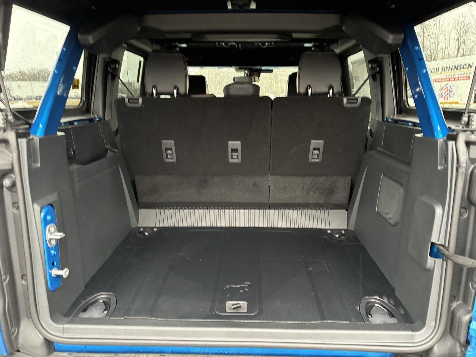 Includes advanced 4x4 with automatic on demand engagement, 4.46 final drive ratio with electronic locking rear axle, auxiliary switches with pre-run accessory wires located in overhead console, front map lights, powder coated steel front and rear bumpers, full vehicle steel bash plates, front row interior grab handles in center floor console and passenger side, LED fog lamps, rock rails, washout capable rubberized flooring with drain plugs, and 17 inch black high gloss-painted aluminum wheels.